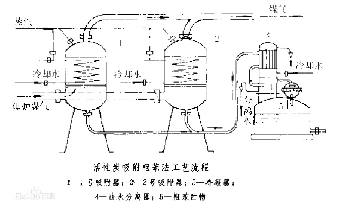 活性炭吸附粗苯法的工藝流程見上圖。終冷后的焦?fàn)t煤氣進(jìn)入1號吸附器的底部,通過活性炭層由頂部排出。當(dāng)活性炭層吸附粗苯達(dá)到飽和時,煤氣被切換到2號吸附器。同時從1號吸附器頂部通入水蒸氣蒸吹,使活性炭吸附的粗苯解吸出去。粗苯蒸氣和水蒸氣經(jīng)底部導(dǎo)管進(jìn)入冷凝冷卻器,冷凝液流入油水分離器,與水分離后,進(jìn)入粗笨貯槽。吸附期間,向吸附器內(nèi)的蛇管通入冷卻水以帶走吸附熱。在蒸吹解吸后通入熱空氣或熱煤氣。使活性炭干燥,然后向蛇管內(nèi)通水冷卻活性炭。
